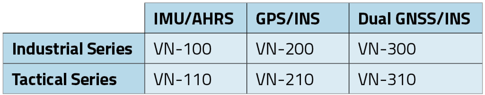 Each product type is offered in two performance categories, Industrial and Tactical Grade, which is an indication of the quality of the IMU core.
