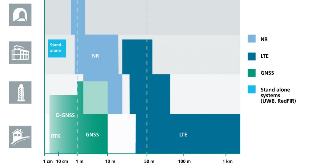 Respective positioning performance for 5G NR and other technologies in different environments. (Image: Fraunhofer IIS)