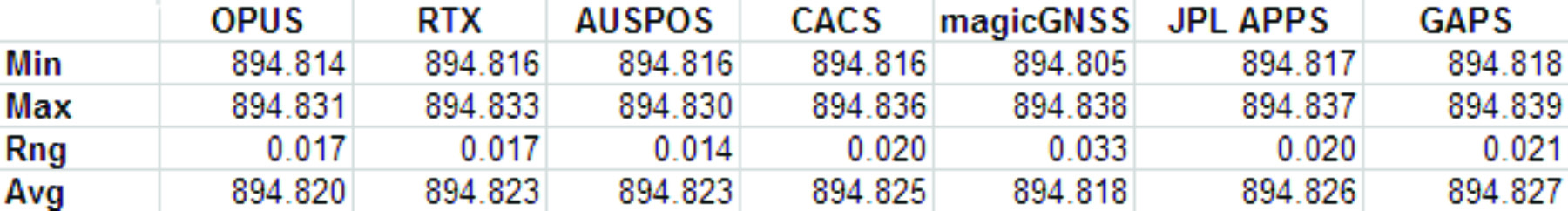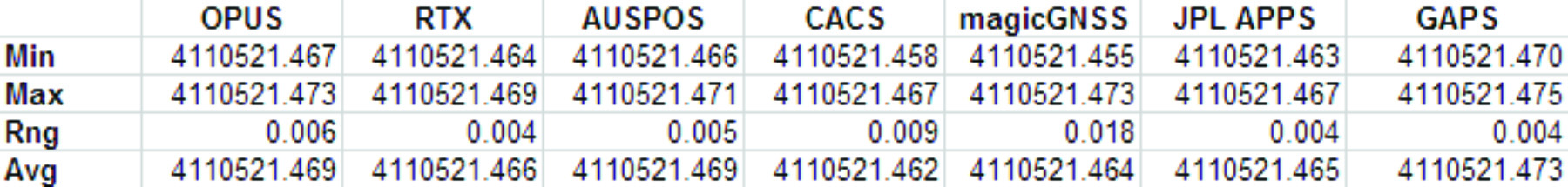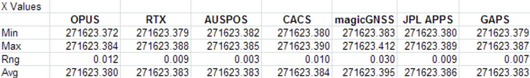 Each of the 32 files were submitted to each of the processing services and the results have been tabulated for X, Y and Ellipsoid Height. All data is presented in IGS08 current epoch framed coordinates. All data has been projected to UTM Meters for these comparisons.