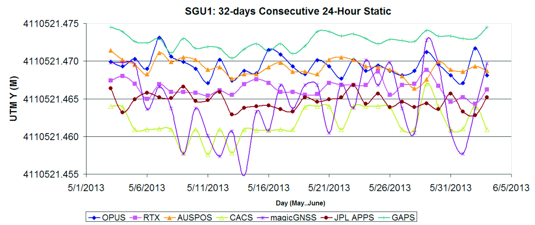 As you can see in Figure 1 above, the services were generally within 5mm of OPUS in X, Y and Height.