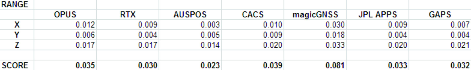 The combined range rewards a processing scheme that best estimates delays, interference, clock errors and other sources of change that occurred during the 32-day trial.