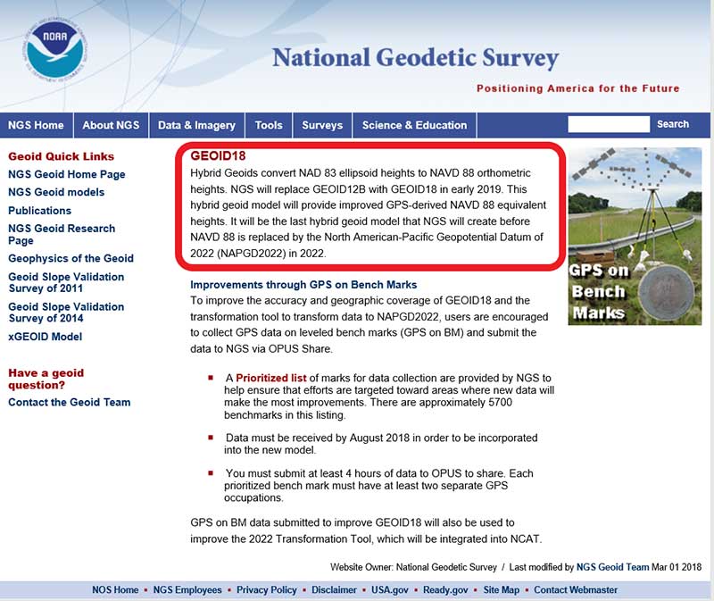 My last column provided an update and status report on stations observed in support of the 2018 GPS on BMs program. Many stations with potential invalid published orthometric heights have been identified by the GPS on BM program. This information will be very useful to the surveying and mapping community as well as to NGS. Once NGS publishes the next hybrid geoid model, GEOID18, OPUS results will probably provide an estimate of the NAVD 88 orthometric height computed using GEOID18 similar to what it does now using GEOID12B. In my opinion, the results of GEOID18 will be better than GEOID12B in most areas of the United States and will be helpful in identifying stations that have moved since they were last leveled.