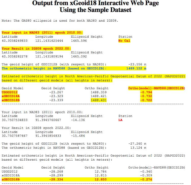 Users should note that the output of the xGeoid18 interactive web service provides the results in IGS08 epoch 2022.00. The output provides an estimate of the NAVD 88 orthometric height based on GEOID12B, an estimate of the NAPGD2022 orthometric height based on xGeoid18b, and the difference between NAPGD2022 and NAVD 88. The box titled “Output from xGeoid18 Interactive Web Page Using the Sample Dataset” shows the output from the interactive web service using the sample dataset provided by the web service.