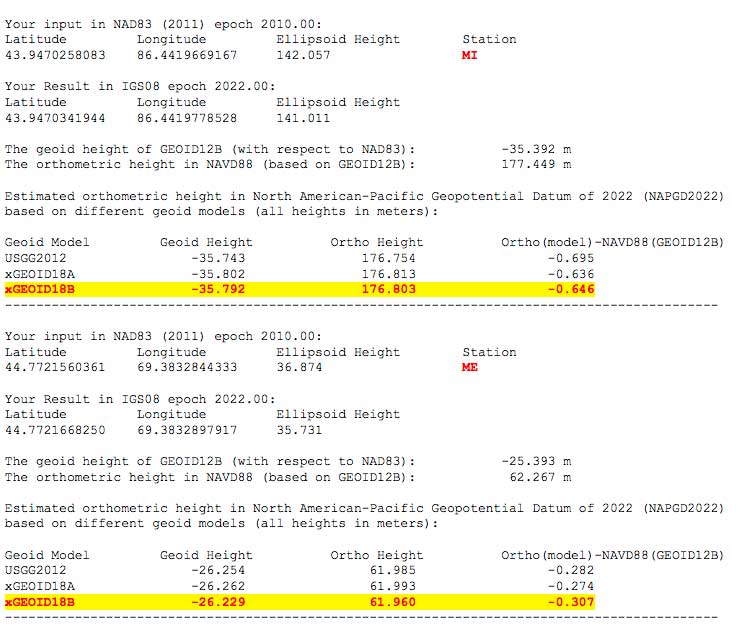 The sample dataset has four stations — a station in California, Louisiana, Michigan and Maine. The results indicate that the differences will vary from state to state — the difference between NAPGD2022 and NAVD 88 in California using xGeoid18b is -0.722 meters, in Louisiana the difference is -0.274 meters, in Michigan the difference is -0.646 meters, and in Maine the difference is -0.307 meters (see box titled “Output from xGeoid18 Interactive Website Using the Sample Dataset”). More detailed estimates of differences between NAPGD2022 and NAVD 88 based on xGeoid16b can be found in my June 2017 column.