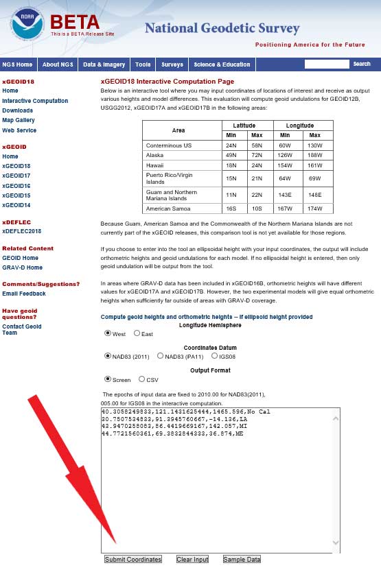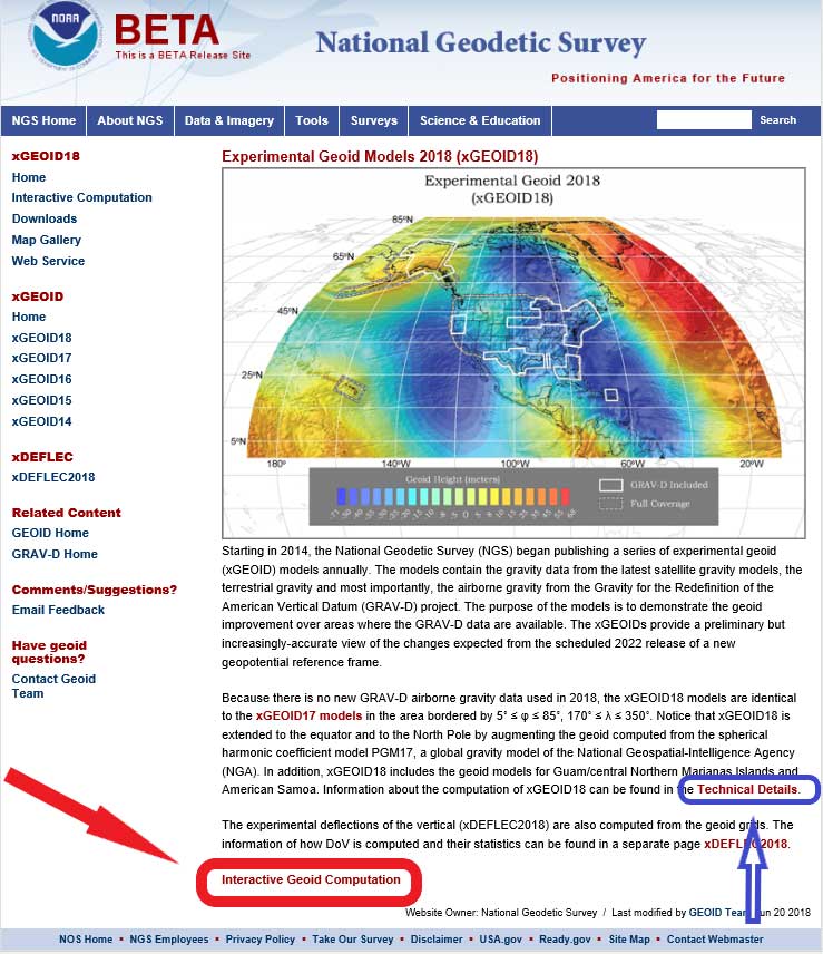 Once users get to the xGeoid18 web site, they can obtain estimates of xGeoid18 values for any latitude and longitude by clicking on the button titled “Interactive Geoid Computation.” See red arrow in box titled “NGS’ Experimental Geoid Models 2018 Web Site.”