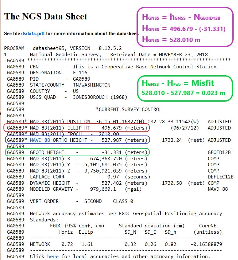 The box titled “Excerpt from The NGS Data Sheet for Station E 116 (PID GA0589)” provides the output from NGS data sheet retrieval program. The first item to note is that if you compute the GNSS-derived orthometric height (HGNSS) using the formula: