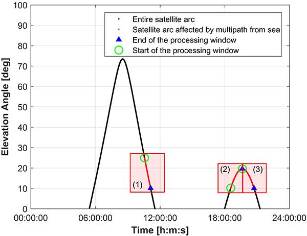For example, FIGURE 4 shows the processing windows determined for the GPS satellite PRN 1 on June 1, 2018. The red dots in the figure show the parts of the satellite arcs affected by multipath from the sea surface. The data was divided into three processing windows due to the arc discontinuities and satellite path directions. It should be noted that only the processing windows with a data span of 30 minutes or longer were used for water level estimation. This minimum data span duration of 30 minutes was empirically determined by observing the probability of failure of the water -level calculation for shorter spans.