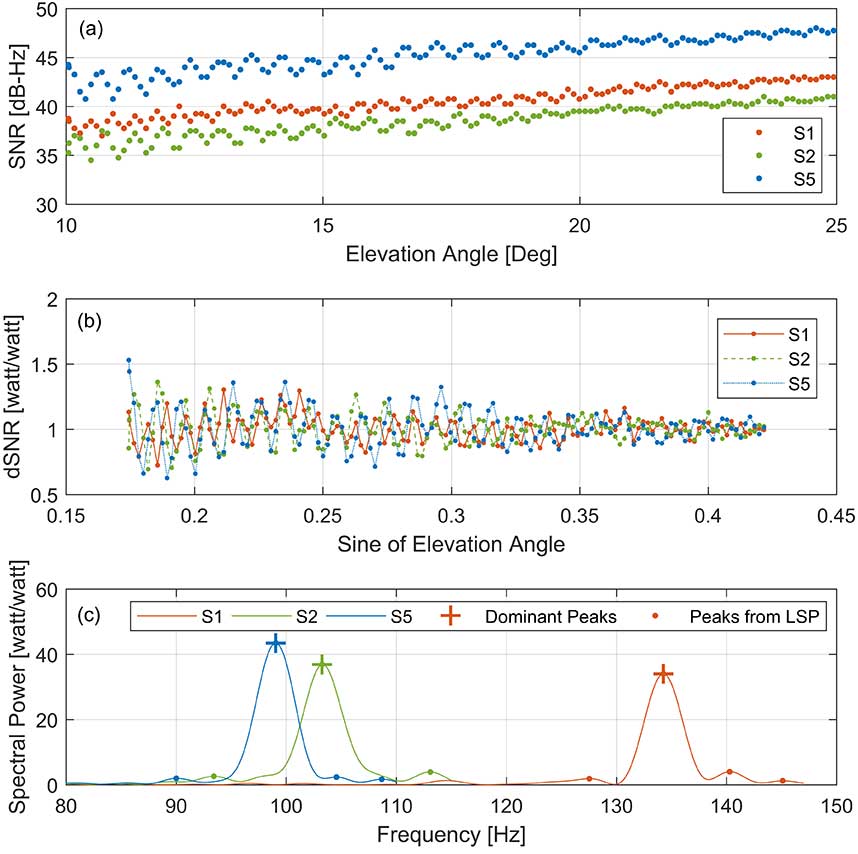To isolate multipath effects from the SNR observation, we removed the trend in the SNR by a second-order polynomial fitting using only the portion of a satellite arc contained within each window. FIGURE 5 (b) shows the detrended SNR (dSNR) from FIGURE 5 (a), and the impact of the multipath is clearly identified in the form of the oscillation. As discussed earlier, the oscillation frequency is related to the antenna height above the sea surface. Accordingly, the dSNR data was analyzed through an LSP. As shown in FIGURE 5 (c), multiple peaks are founded from the LSP results of each dSNR series, and it is not easy to distinguish the frequency of the reflected signal from the sea level among these peaks.
