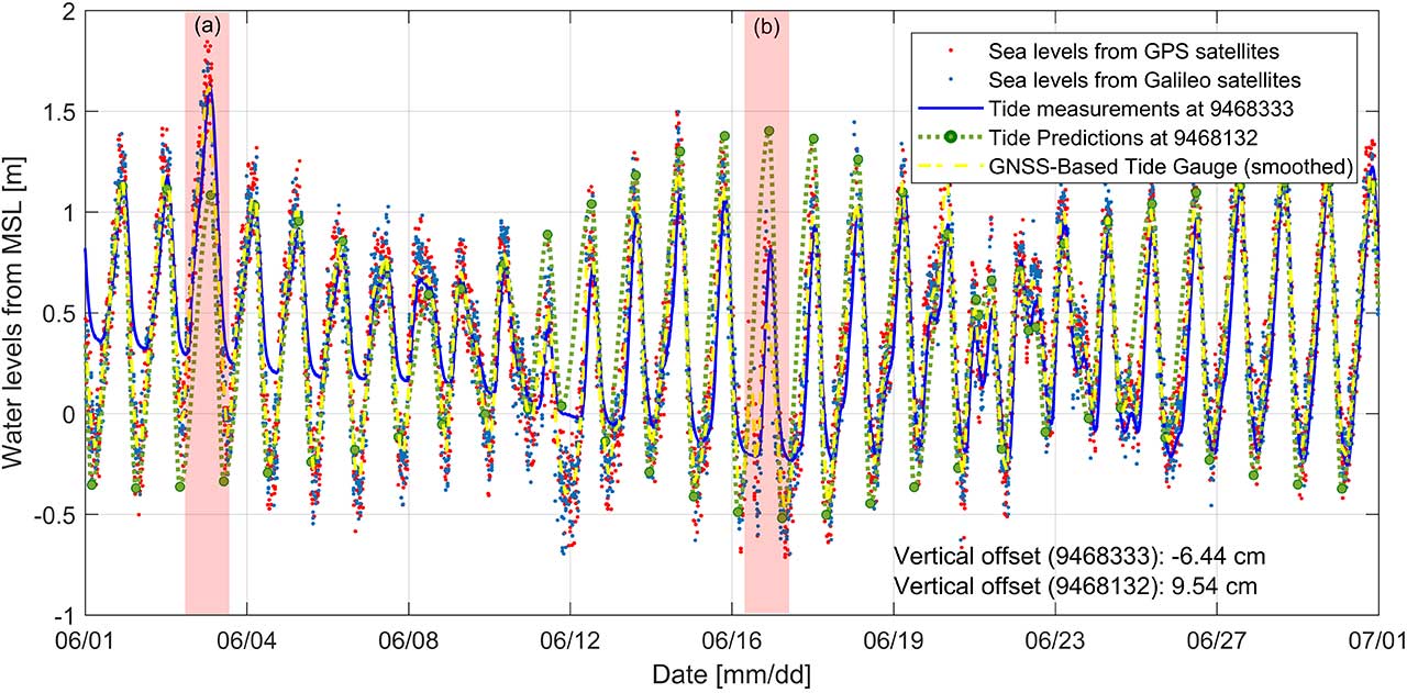 FIGURE 6 shows the sea level derived from the GNSS-based tide gauge measurements using GPS (red dots), Galileo (blue dots), the predicted sea level from the St. Michael tide gauge (green dots and lines) and measured sea level from the Unalakleet tide gauge (blue line).