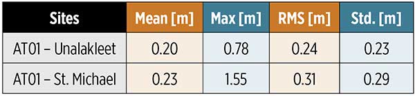This was done because the Unalakleet tide gauge is approximately 74 kilometers away from AT01 and the St. Michael tide gauge does not provide actual measurements, making it difficult to use as ground truth. As a result, the sea levels determined using the Galileo and GPS signals showed very similar accuracy with an average difference of 0.11 meters. Therefore, even if Galileo is additionally used, the estimated final water levels were at a similar level of accuracy.