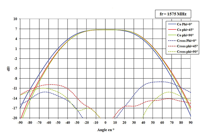 The CRPA consists  of seven elementary patches covering E5a, E5b, L2, E6, L2, and L1 frequency bandwidths, using microstrip multilayer technology. Each element is housed in a 9-centimeter (diameter) by 2-centimeter (height) radome, connector excluded. In that volume, a space provision has been reserved to include a low-noise amplifier (LNA) and two filters for a sharp out-of-band rejection. As a consequence, it is possible to configure three types of arrays: passive without filters, passive with two passband filters, and finally active (including a LNA, with a gain > 26dB, NF<0.9dB) with two passband filters. The maximum gain levels in these configurations are from 3.6 dBi to 29.8 dBi. For radiation patterns, see Figure 2.