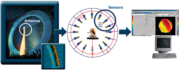 More precisely, the arch test range instantaneously scans the field in one whole site angle cross-section plane, whereas the legacy systems mechanically scan the same cross-section plane by rotating the AUT for each incremental angle value. The spatial sampling of the near-field radiated by the AUT, thanks to a large number of probes along the arch surrounding it, enables a significant savings in time. The near-field results in the current plane can be displayed in real-time on a computer screen. Then, the rotation of AUT around its axis is automatically controlled by the measurement system, and a new acquisition is performed for each new cross-section plane. A Fourier transform computation is eventually applied to the 3D near-field to get the far-field radiation pattern.