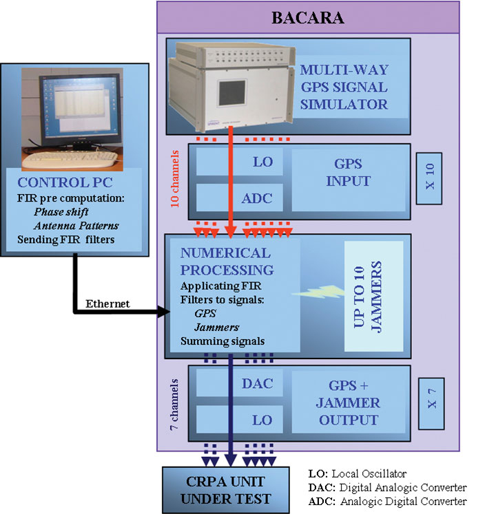 Unfortunately, BACARA currently operates on L1 or L2, but not on the E6 and E5 bandwidths. On the other hand, this test bed is able to simulate dynamic trajectories, with the mobile positions and attitudes. Up to 10 internal jammers with various waveforms can be set up, and their power levels over time are computed by software like Warfare or Matlab. A numerical calibration allows some transparency of the test bed for CRPA units under test.