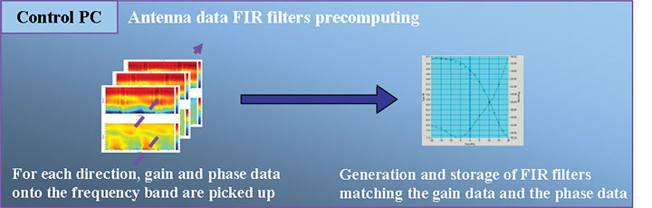 New Test Bed. DGA recently acquired a test bed, developed by INEO Defense, that enables evaluating CRPA units in conducted mode, for example. There is no longer a need to radiate either GPS signals or interfering signals. The purpose of this test bed, called BAnc de Caractérisation des Antennes Réseaux Antibrouillage (BACARA), or test bed to characterize anti-jamming antenna arrays (Figure 4 and Figure 5), is to replace the array and simulate its GPS and jamming environment. This means that it is able to create elementary antenna phase delays and gains resulting from the array geometry, by using finite impulse response (FIR) filters (Figure 6). This is the reason why this test bed must be fed with the array phase and gain measurement results obtained with the arch test range.