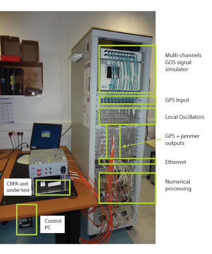 Classical Tests. DGA plans to perform outdoor test campaigns by utilizing an array placed on the roof of an all-terrain vehicle (see photo). The array will be connected to a CRPA GPS processing unit and to a receiver in the vehicle. Some interferers will be located along the trajectory of the vehicle, according to various scenarios defining their waveforms and their power levels. The CRPA capability to reject those interferers can then be assessed. These kinds of outdoor tests naturally suit CRPA’s processing unit and array characterization, as they involve radiated GPS and interfering signals. However, these kinds of tests are not reproducible and are quite complicated to set up.