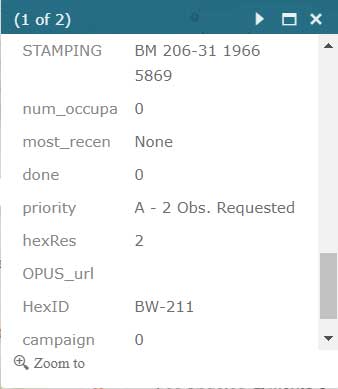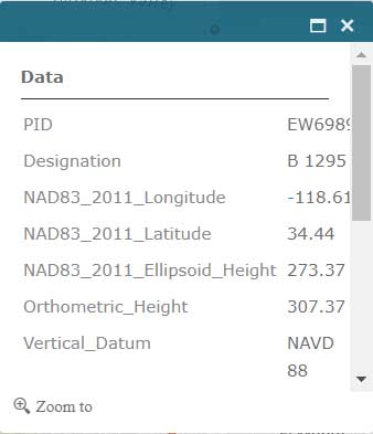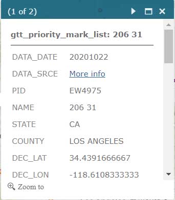 Users that are participating in NGS’ GPS on Bench Mark program can click on the layer for “NGS GPS on Bench Marks Transformation Service Tool, priority 10 km hex” to determine marks that need to be occupied by GNSS to improve a transformation tool being developed by NGS. See boxes titled “NGS GPS on Bench Marks Transformation Service Tool, priority 10 km hex” and “Information for GPS on Bench Mark Priority List for PID EW6989.” There’s also layers that depict the priority mark list for the GPS on Bench Marks program (“NGS GPS on Bench Marks Transformation Tool Service — priority mark list”) and the 2 km hexagon priority grid (“NGS GPS on Bench Marks Transformation Tool Service — priority 2km hex”).