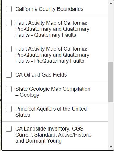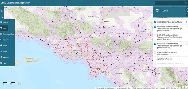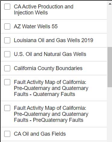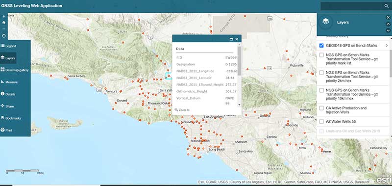 As you can see from the list of layers, the web application enables users to select the layers that are pertinent to their survey project requirements. The application is designed for California surveyors but the concept is transferable to other States. For example, the following layers are not just for California surveyors: Arizona water wells, Louisiana oil and gas well, U.S. oil and natural gas wells, Principal Aquifers of the United States, and, of course, all of the NOAA NGS data layers.