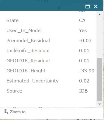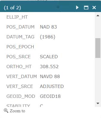 The application also has a feature that lists the marks that were involved in the development of NGS’ hybrid geoid model GEOID18. (see the box titled “GNSS Leveling Web Application GEOID18 GPS on Bench Mark Layer”). Clicking on a mark’s icon provides information and statistics about the mark (see boxes titled “GEOID18 GPS on Bench Mark Layer — PID EW6989” and “Information for GPS on Bench Mark for PID EW6989”). This is one of the layers that provides information for the entire CONUS region. All this information is available from NGS’ website but this application incorporates all of NGS’s data as well as the local information in one application. This web application is very useful to a surveyor planning a survey project and/or providing information to a field reconnaissance team.