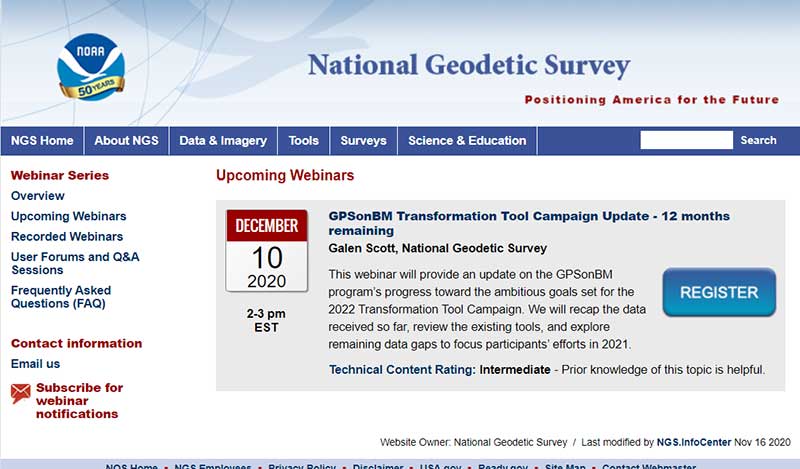 Individuals interested in participating in NGS’ GPS on Bench Mark program should register for NGS’ Dec. 10 webinar, which will discuss the status of the program. See the box titled “GPSonBM Transformation Tool Campaign Update — 12 months remaining” for the information on the webinar. Users can register for the webinar here. I would encourage all users to access the web application tool developed by Jay and/or NGS’ website before participating in the next NGS GPS on Bench Mark webinar.