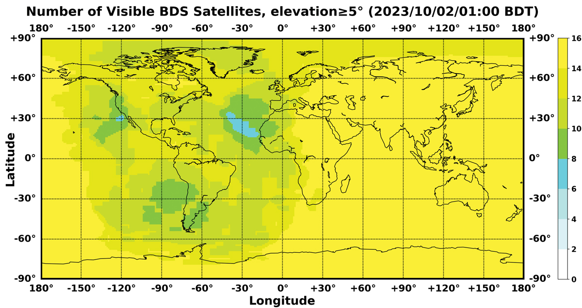 In May, the first BDS-3 GEO backup satellite was successfully launched. Currently, BDS operates a total of 46 satellites in orbit, comprising 15 in the BDS-2 constellation and 31 in the BDS-3 constellation. Since its official commissioning, BDS has been consistently providing reliable services with steadily improving performance metrics. Data from the International GNSS Monitoring and Assessment System (iGMAS) in 2023 indicate that the BDS space signal availability is 100%, signal continuity is 99.996%, and the global positioning accuracy is 5 m, with notable enhancement observed specifically within the Asia-Pacific region. Figure 1 shows the positioning accuracy of the BDS B1C signal assessed with global monitoring stations. Figure 2 shows the number of visible BDS satellites, with a minimum of six to eight satellites consistently in view globally.