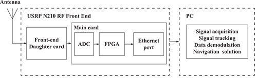 A comparison of current traditional RF front-ends and different RF front-end implementation types led us to the conclusion that one model of a universal software radio peripheral, the USRP N210, would make an appropriate RF front end option. USRP N210 utilizes a low-IF complex direct down-conversion architecture that has several favorable properties, enabling developers to build a wide range of RF reception systems with relatively low cost and effort. It also offers high-speed signal processing. Most importantly, the source code of USRP firmware is open to all users, enabling researchers to rapidly design and implement powerful, flexible, reconfigurable software radio systems. Therefore, we chose the USRP N210 as our reception device to develop our wide-band multi-constellation GNSS receiver, shown in Figure 1.