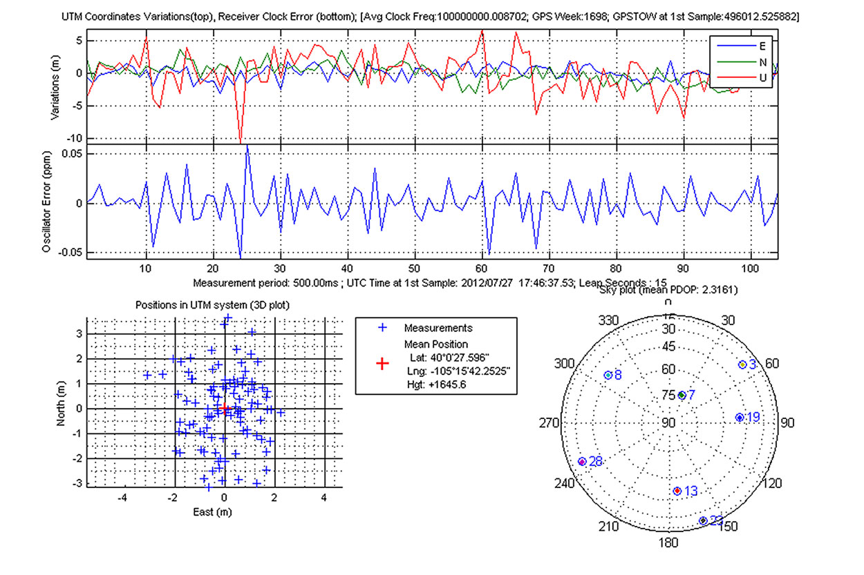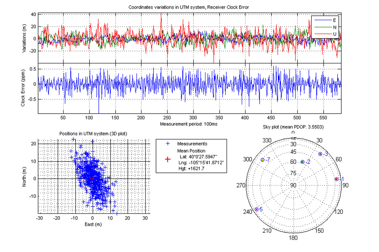 We could not do the full-constellation position solution because Galileo was not broadcasting navigation data at the time of the collection and the ICD for BeiDou had not yet been released. Therefore, respectively using GPS and GLONASS tracking results, we provided the position solution and timing information that are illustrated in Figure 14 and in Figure 15.