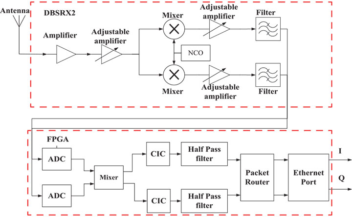 The USRP N210 platform includes a main board and a daughterboard. In the main board, 14-bit high precision analog-digital converters (ADCs) and digital-analog converters (DACs) permit wide-band signals covering a high dynamic range. The core of the main board is a high-speed field-programmable gate array (FPGA) that allows high-speed signal processing. The FPGA configuration implements down-conversion of the baseband signals to a zero center frequency, decimates the sampled signals, filtering out-of-band components, and finally transmits them through a packet router to the Ethernet port. The onboard numerically controlled oscillator generates the digital sinusoid used by the digital down-conversion process. A cascaded integrator-comb (CIC) filter serves as decimator to down-sample the signal.