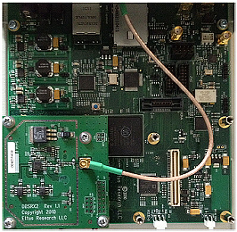 Figure 2 shows an example GNSS signal-streaming path schematic on a USRP N210 platform with a DBSRX2 daughter board. Figure 3 shows a photograph of internal structure of a USRP N210 platform.