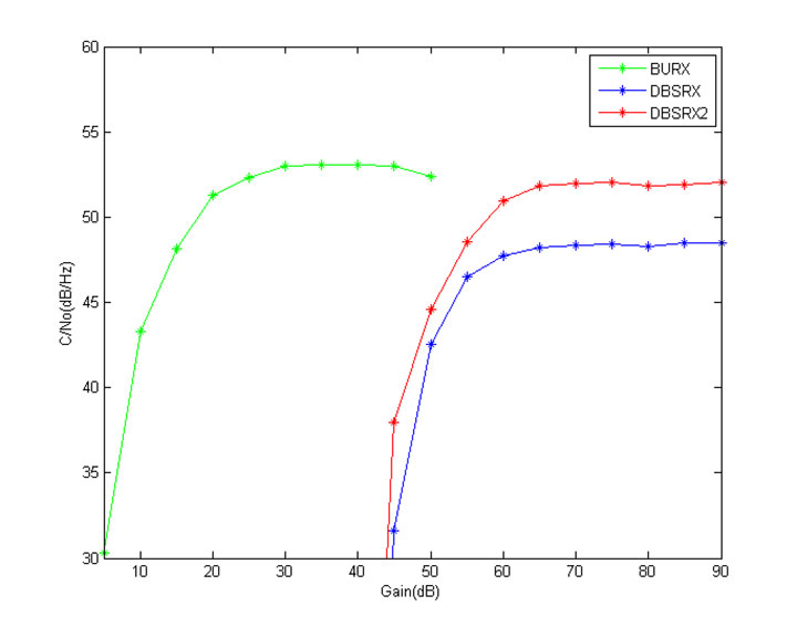 The second experimental setup configuration used a USRP N210 platform, an external OCXO oscillator to provide stable reference clock, and a GPS simulator to evaluate the C/N0 performance of the three daughter boards. The input RF signals are identical, as they come from the same configuration of the GPS simulator. Figure 8 illustrates the C/N0 performance comparison based on this experimental configuration. The figure shows that BURX performs best, with DBSRX2 just slightly behind, while DBSRX has a noise figure penalty of 4dB.