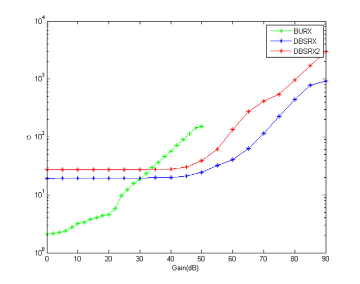 • BURX has a better sensitivity than DBSRX and DBSRX2 when the gain is set below 30dB.