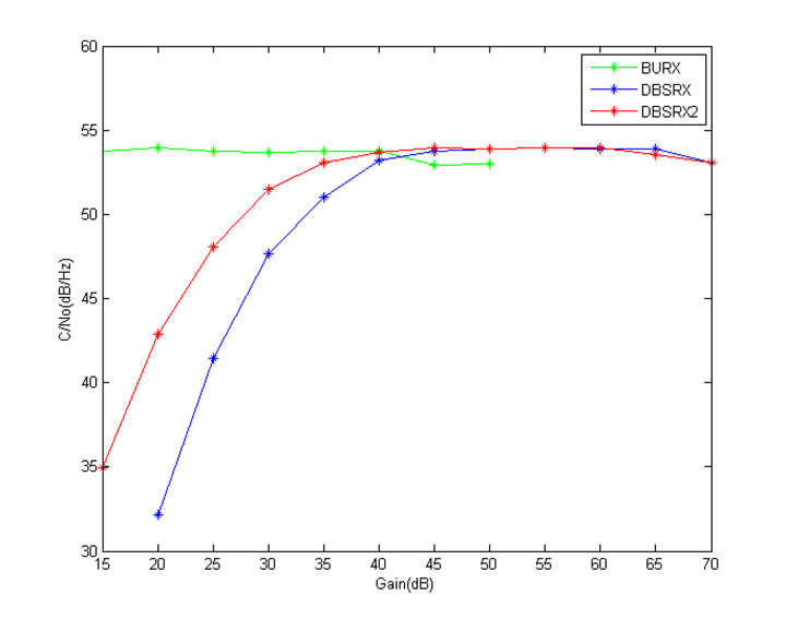 In the third experiment, we added an external amplifier to increase the signal-to-noise ratio (SNR). From Figure 9, we see that the BURX, DBSRX and DBSRX2 have the same C/N0 performance, effectively validating the above conclusion. Thus, an external amplifier is recommended when using the DBSRX or DBSRX2 daughter boards.