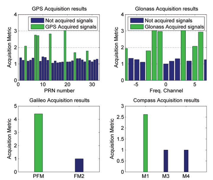 By processing raw wide-band multi-constellation GNSS signals through our software receiver, we successfully acquired and tracked satellites from the four constellations. In addition, since we achieved 100MHz bandwidth, we can also simultaneously capture modernized GPS and Galileo signals (L5 and L2; E5a and E5b, 1105–1205 MHz).