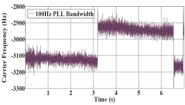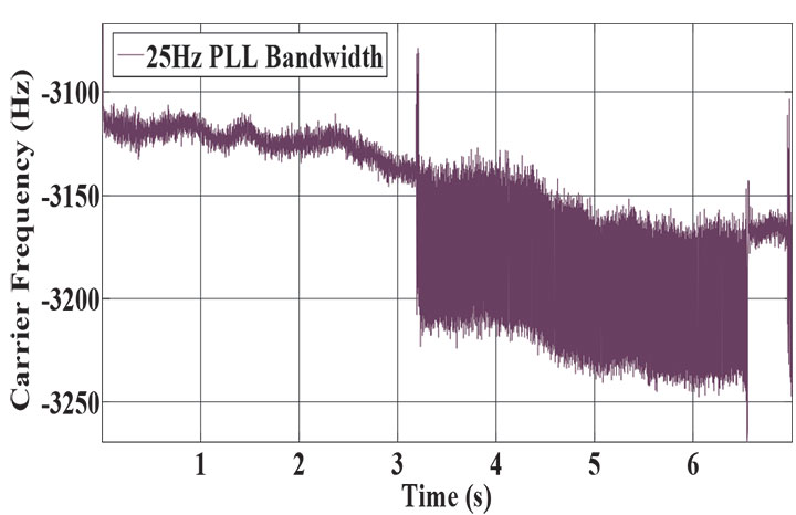 Finally, when we conduct the tracking operation through the software receiver, this large frequency offset is beyond the lock range of a narrow, typically desirable, GNSS carrier tracking loop, as shown in Figure 4.