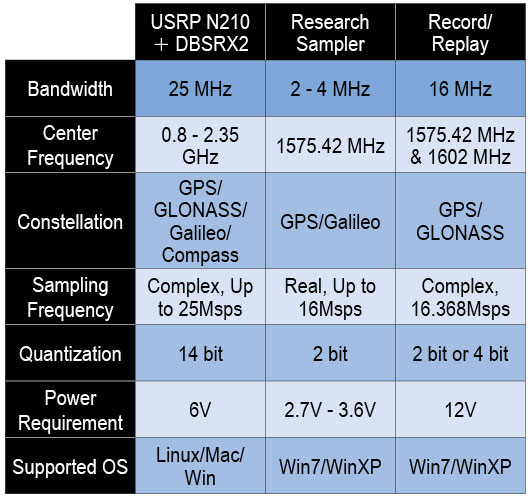 The purpose of these experiments was to find a suitable daughter board for collecting wide-band multi-constellation GNSS RF signals. The important qualities of an appropriate wide-band multi-constellation GNSS receiver are: