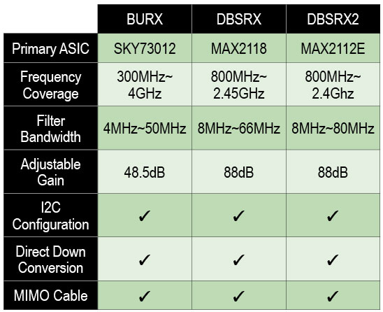 The three daughter cards have diverse properties, such as the primary ASIC, frequency coverage range, filter bandwidth and adjustable gain. BURX gives wider radio frequency coverage than DBSRX and DBSRX2. DBSRX2 offers the widest filter bandwidth among the three options.