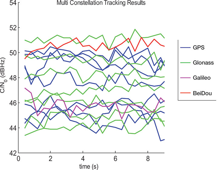 A wide-band antenna collected the raw GNSS data, including GPS, GLONASS, Galileo, and BeiDou. An external amplifier was included to decrease the overall noise figure. An OCXO clock was used as the reference clock of the USRP N210 system. After we found the times when Galileo and BeiDou satellites were visible from our location, we first tested the antenna and external amplifier using a commercial receiver, which provided a reference position. Then we used 1582MHz as the reception center frequency and issued the corresponding command on the host computer to start collecting the raw wide-band GNSS signals. By processing the raw wide-band GNSS data through our software receiver, we obtained the acquisition results from all constellations shown in Figure 12; and tracking results displayed in Figure 13.