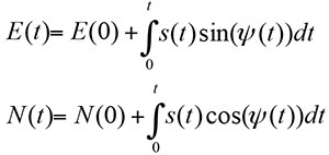 where, s(t) is displacement and ψ(t) is heading. In the case of pedestrian motion, velocity and heading can be assumed to be constant during the interval when a step is taken. With this assumption, the integral form of Equation 2 can be rewritten as a difference equation with piece-wise linear approximation.