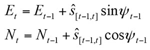 This equation describes a method of dead reckoning (DR) that is based on step counting rather than integration of acceleration and angular rate. This PDR process consists of three important components: the previously known absolute position of the user at time t-1 (Et-1, Nt-1), the stride length or distance traveled by the user since time t-1 (