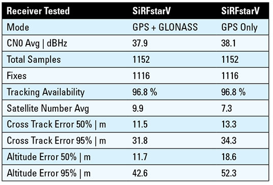 Figure 1 shows the results of an indoor walk test with a SiRFstarV receiver using GPS and GLONASS. The test was done on multiple floors of a three-story commercial building. Table 1 shows a summary of the performance metrics as determined by stopping at benchmark locations during the test. Fixes are available nearly 97 percent of the time. The addition of GLONASS tracking increased the average number of satellite measurements from 7.3 to 9.9 and improved the horizontal and vertical accuracy by about 7 to 15 percent. The horizontal accuracy is about 11.5 meters, 50 percent CEP. However, more than half the fixes are shown outside of the building.