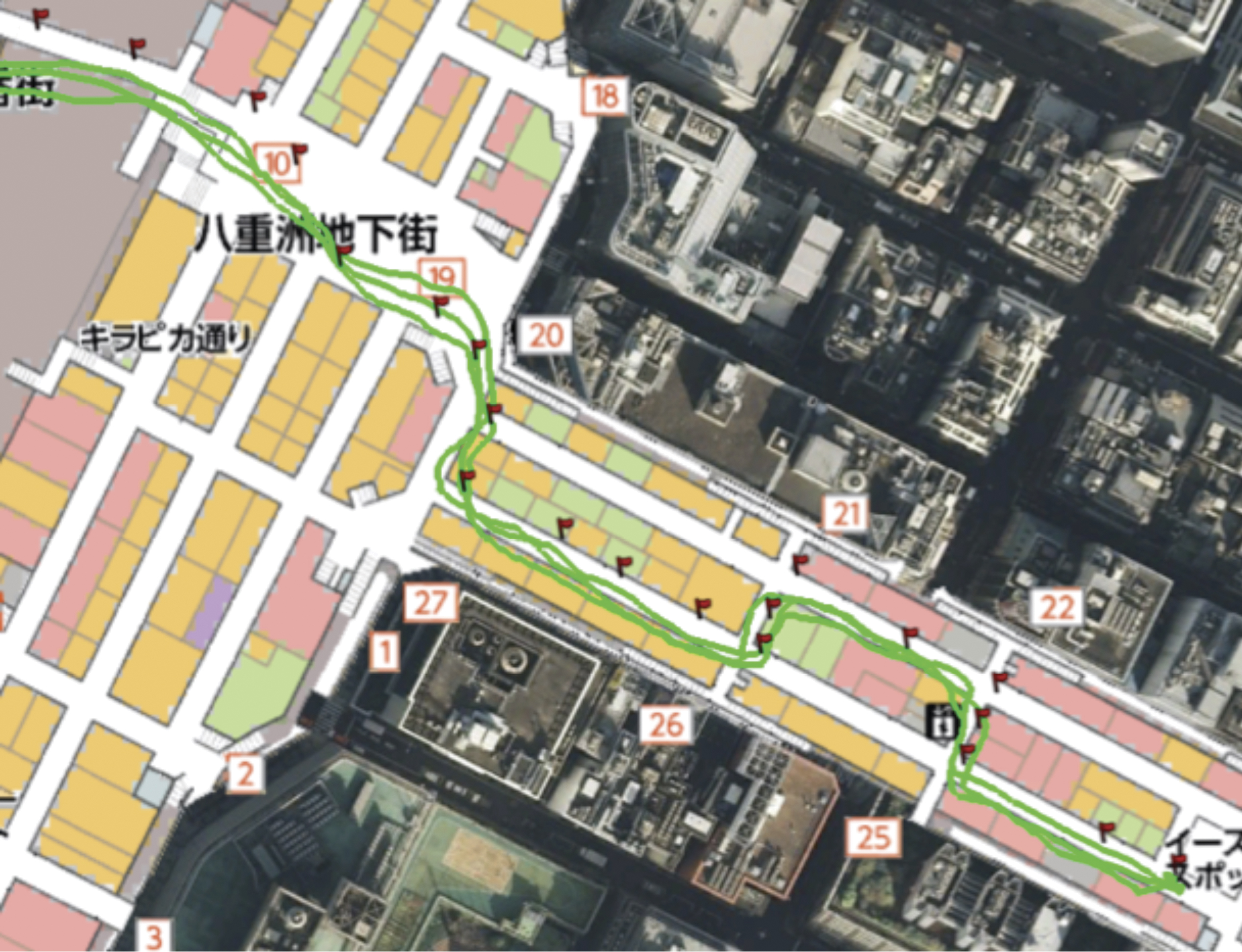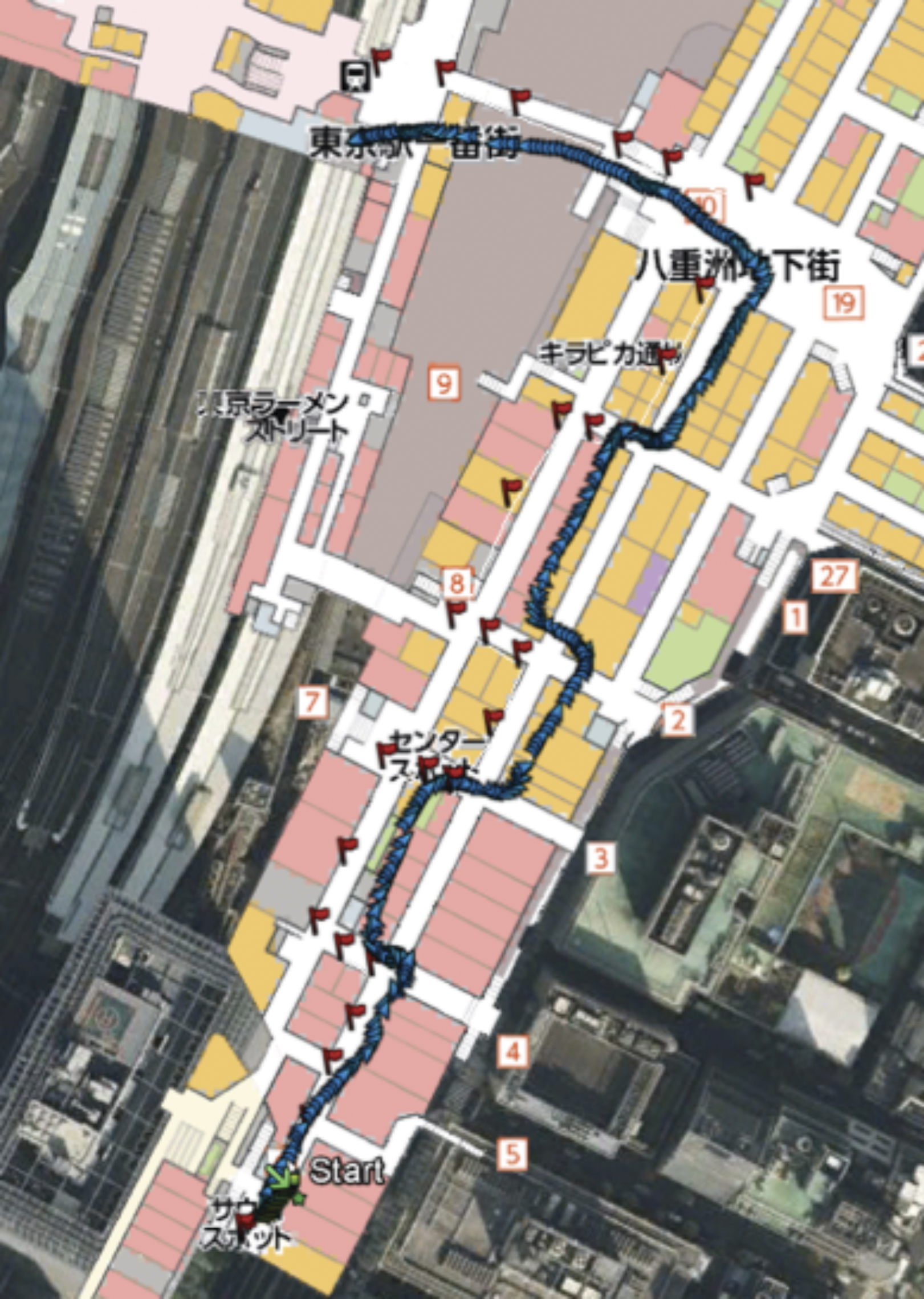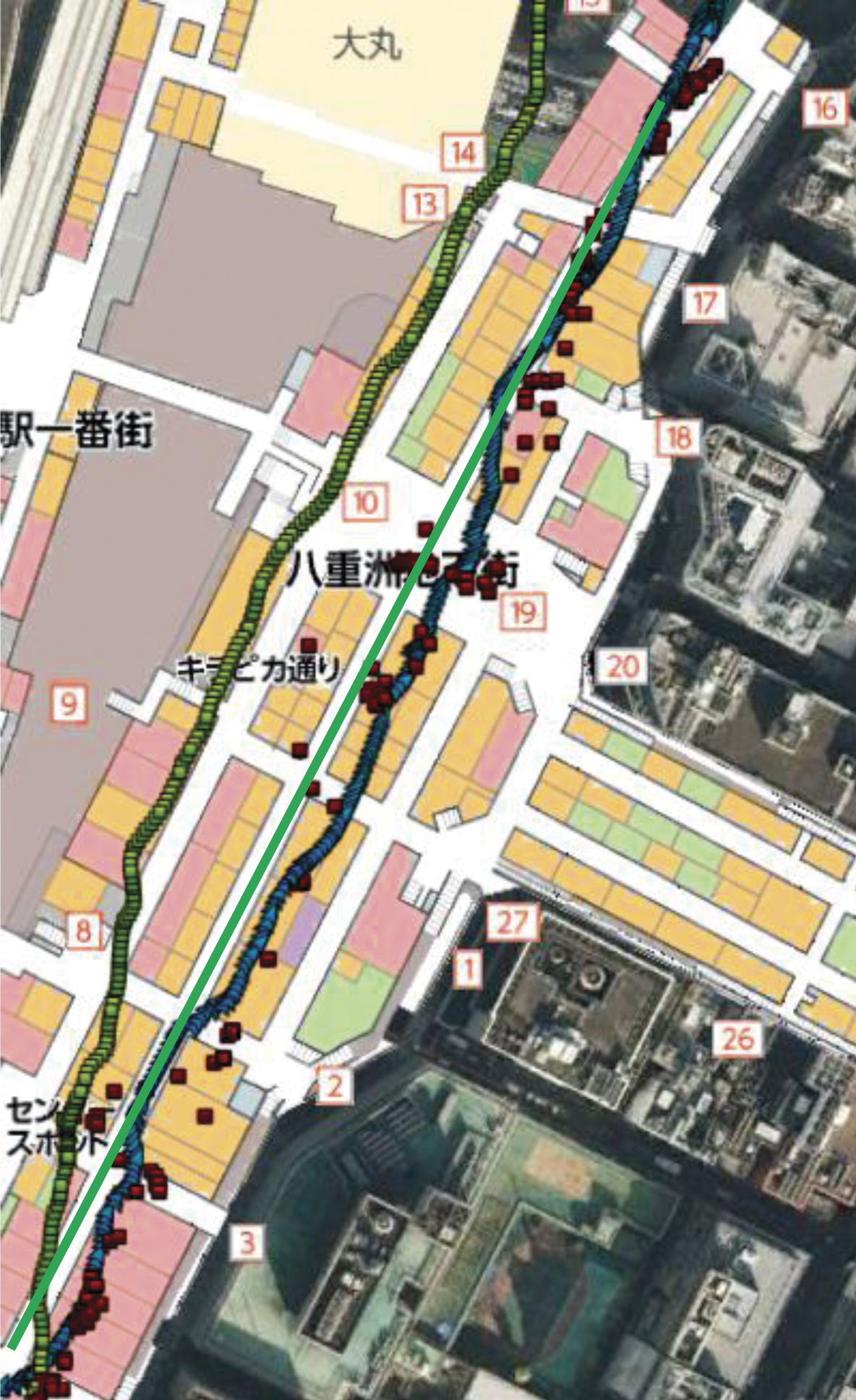 A series of tests were carried out in Tokyo Station in Tokyo, Japan. The tests shown here were all done on the B1F level in the shopping area adjacent to the station. This area is two levels below the tracks and is below ground. There are no windows, and there was no GNSS reception. The environment also has lots of magnetic anomalies due to tracks, trains, elevators, escalators, and many people in motion, which affects Wi-Fi signals. Each plot shows an indoor map superimposed on the Google Earth image of the area. The narrow aisles in the map are about 5 meters wide. The map is used for presenting results only; it was not used to do map-aiding or map-matching.