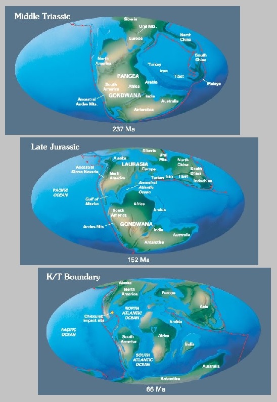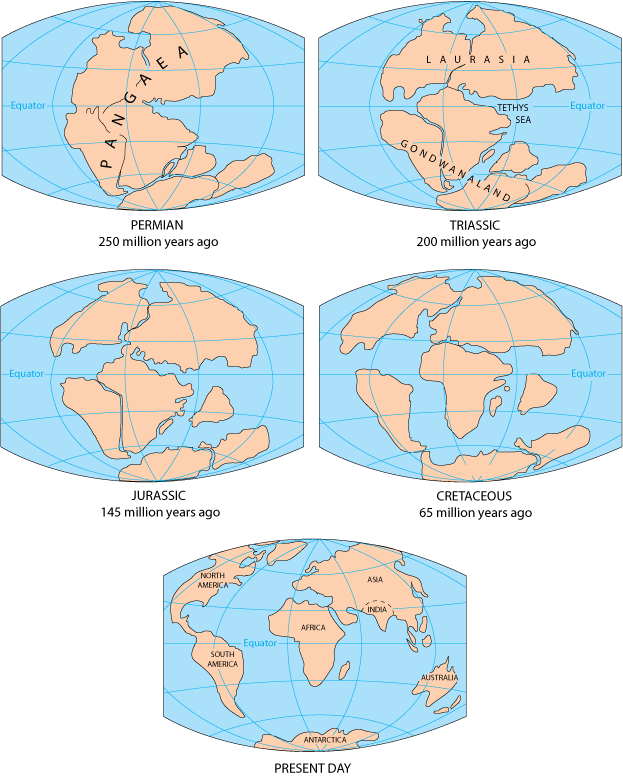 The diagrams below show the break-up of the supercontinent Pangaea (meaning “all lands” in Greek), which figured prominently in the theory of continental drift — the forerunner to the theory of plate tectonics.