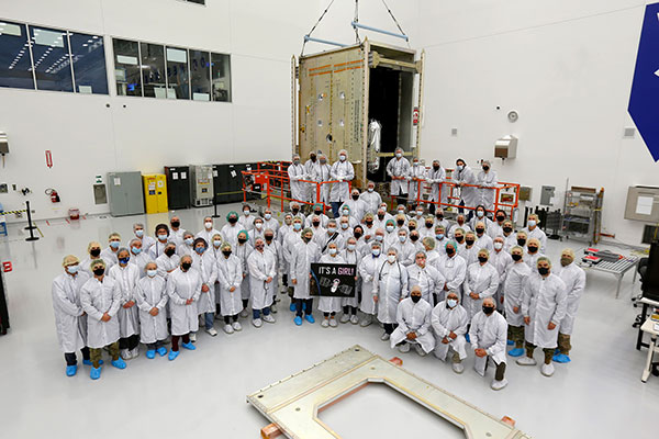 The GPS III government and industry team recently core mated GPS III Space Vehicle 10 (GPS III SV10) and, per tradition at the “birth” of a satellite, nicknamed it “Hedy Lamarr” after the actress and inventor.  (Photo: Lockheed Martin)