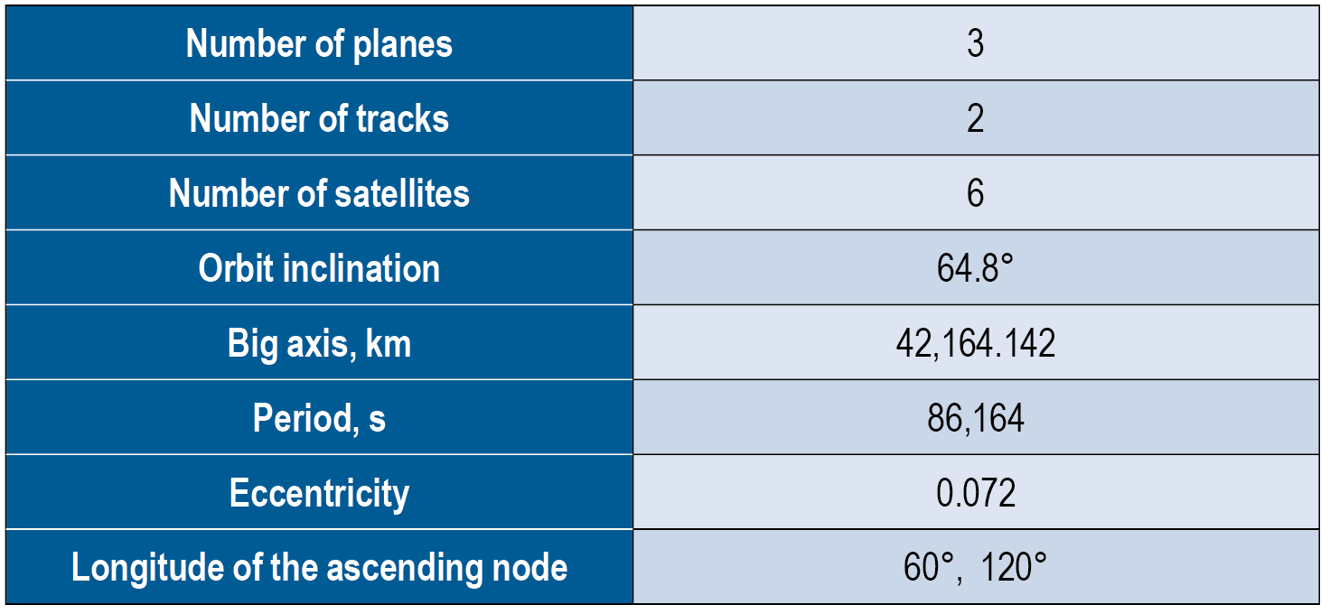 In 2022, the constellation orbits will increase to six satellites in three planes, as we aim to increase the navigation service accuracy and availability (FIGURE 1). See TABLE 1 for satellite orbit parameters. This constellation will make it possible to increase navigation accuracy in the Eastern Hemisphere by about 25% through decreasing the value of the geometric factor.