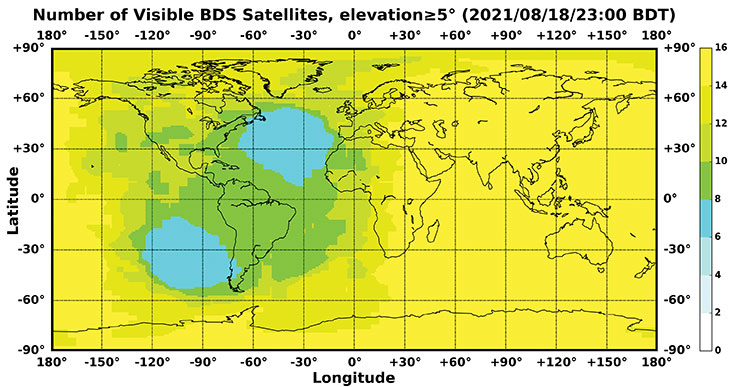 FIGURE 1 shows the number of visible BDS satellites worldwide at BDT 00:00 on Nov. 18, 2021. Among them, the number of visible BDS satellites exceeds 20 in some areas of the Asia-Pacific region.