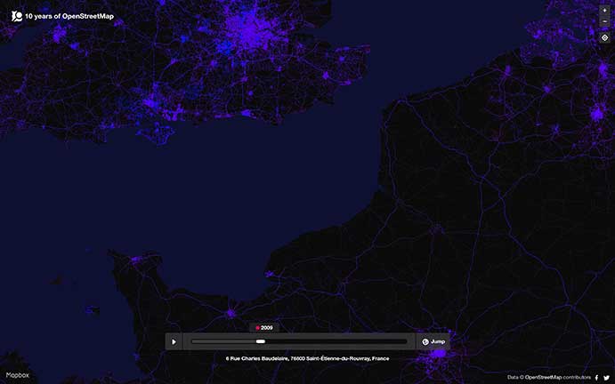 A tool developed by Mapbox explores “10 years of OpenStreetMap.” During that decade, hundreds of thousands of people mapped 25 million miles of roads in every country in the world.
