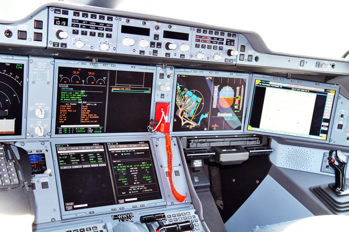 Cockpit of a new EGNOS-equipped Airbus 350 XWB, on show during the inaugural EGNOS Day at Toulouse-Blagnac Airport on May 7, 2015. (Photo: ESA)