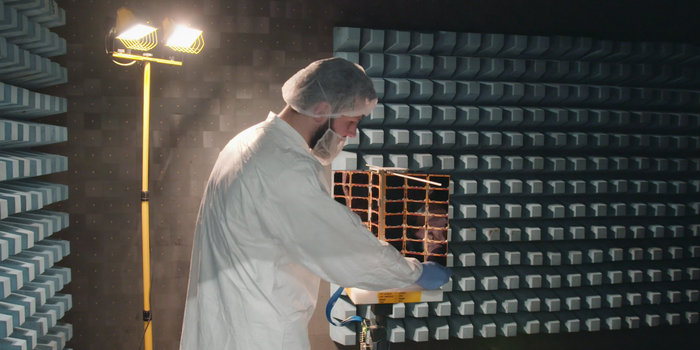 One of Spire’s Satellite Manufacturing Technicians (Tomasz Chanusiak) tests the Radio Frequency capabilities of a LEMUR2 nanosatellite in Spire’s cleanroom in Glasgow, Scotland. (Photo: ESA)