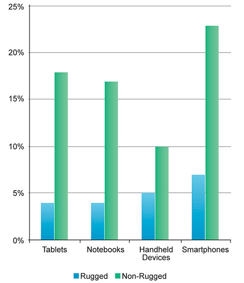 According to 2012 data from VDC Research, the average annual failure rate during the first year of deployment of rugged devices ranged from 4 to 7 percent, while average failure rates of non-rugged devices ranged from 10 to 23 percent. Past the first year of deployment, the fail rate for rugged devices drops while that of non-ruggeds rises, in some cases past 50 percent.