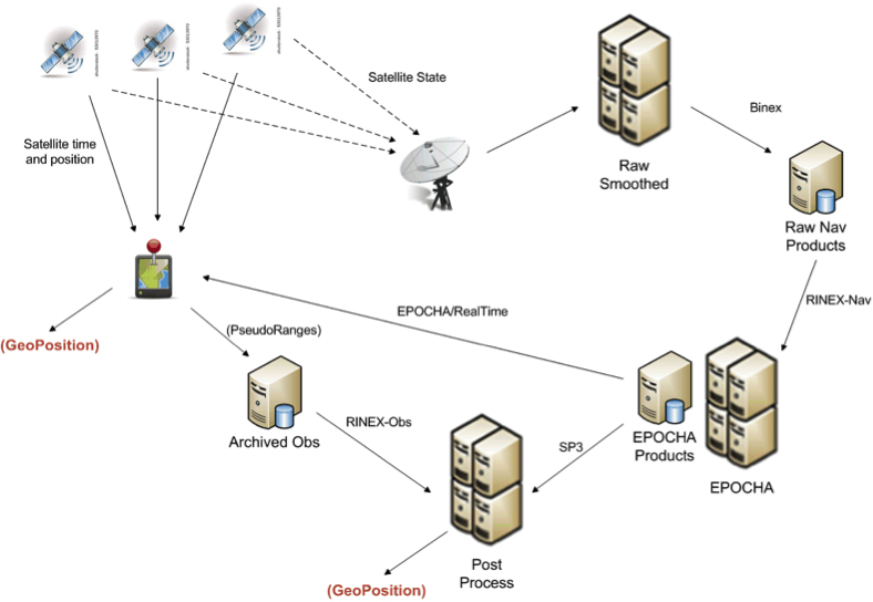 The corrected satellite clock and state data can then be sent to the satellites, to the processing centers to improve geolocation of real-time or archived positions or remotely sensed observations, and to devices in the field to improve real-time position measurements.