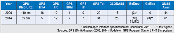 Let’s look at the differences in service between 2006 and 2014 as shown in Table 1. GPS RMS user range error (URE) has been cut in half, and the number of usable GNSS satellites has gone up by 39 percent (44 to 61).